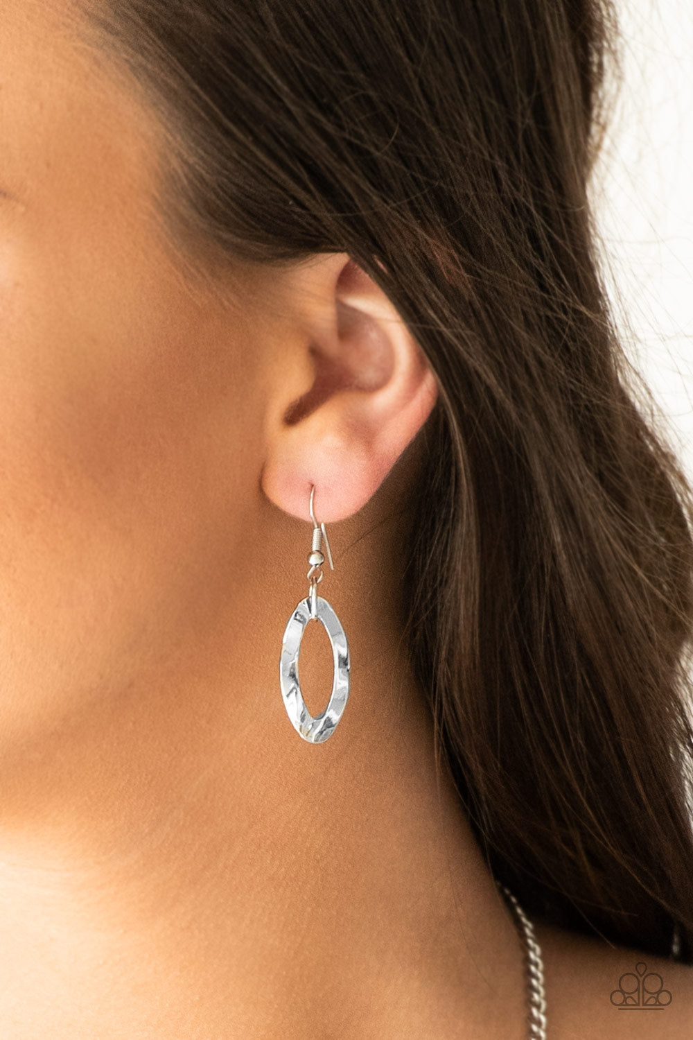 Hammered silver rings give way to rows of mismatched silver chains, creating edgy layers down the chest. A lobster clasp hangs from the bottom of the design to allow a name badge or other item to be attached. Features an adjustable clasp closure.