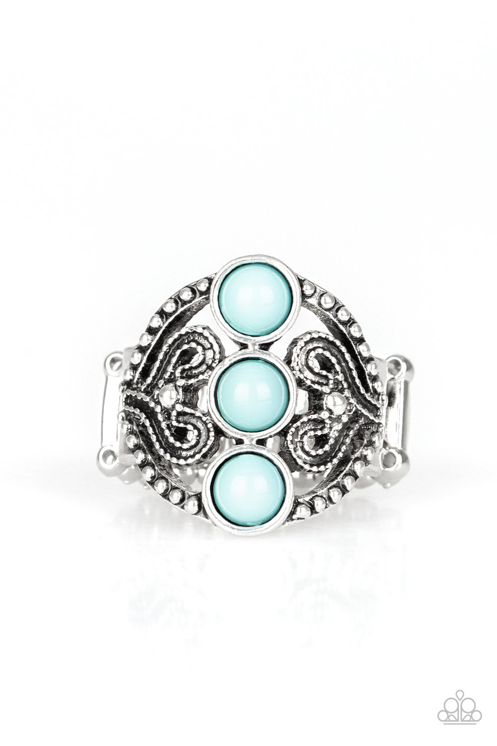 A collection of shimmery silver studs and heart-shaped filigree coalesces into a whimsical frame atop the finger. A trio of blue beads stack down the middle of the frame for a whimsical finish. Features a stretchy band for a flexible fit.